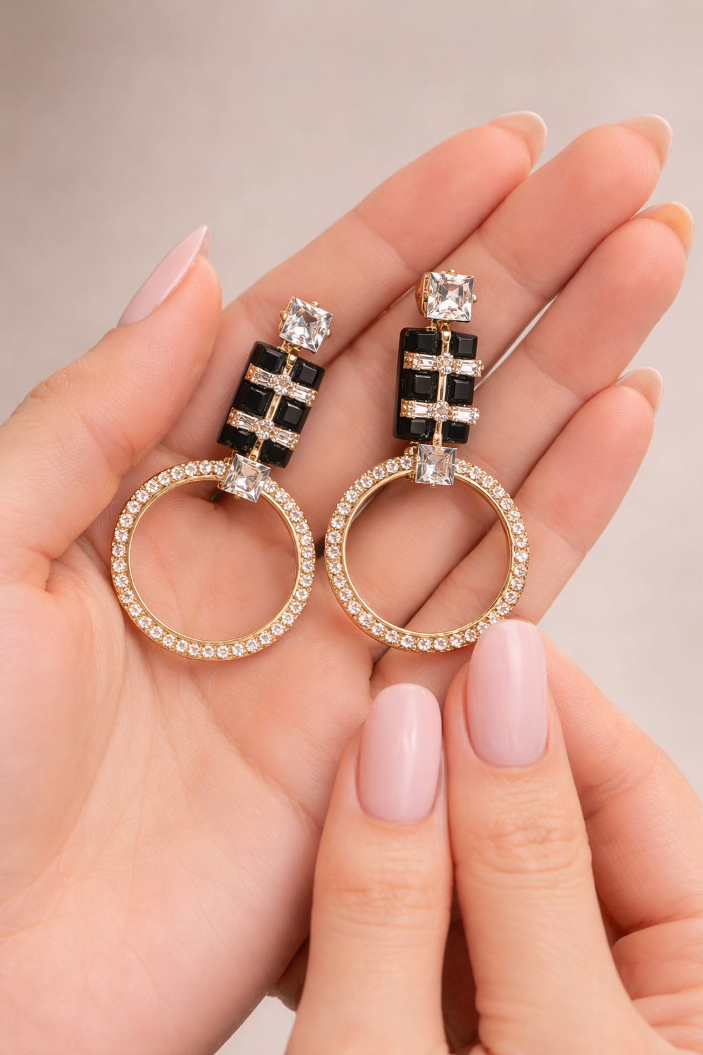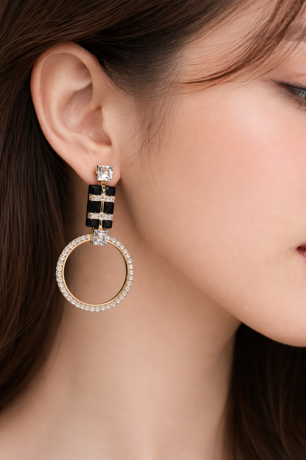 Designed with a sparkling square-cut crystal stud at the top, the earrings feature sleek black enamel detailing accented with delicate crystal bars for a refined, structured finish.